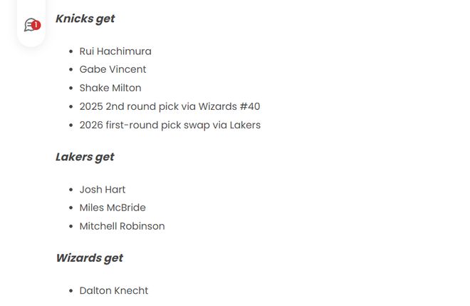 尼克斯得到:八村垒、文森特、米尔顿、2025年奇才40号签、2026年湖人首轮互换权;